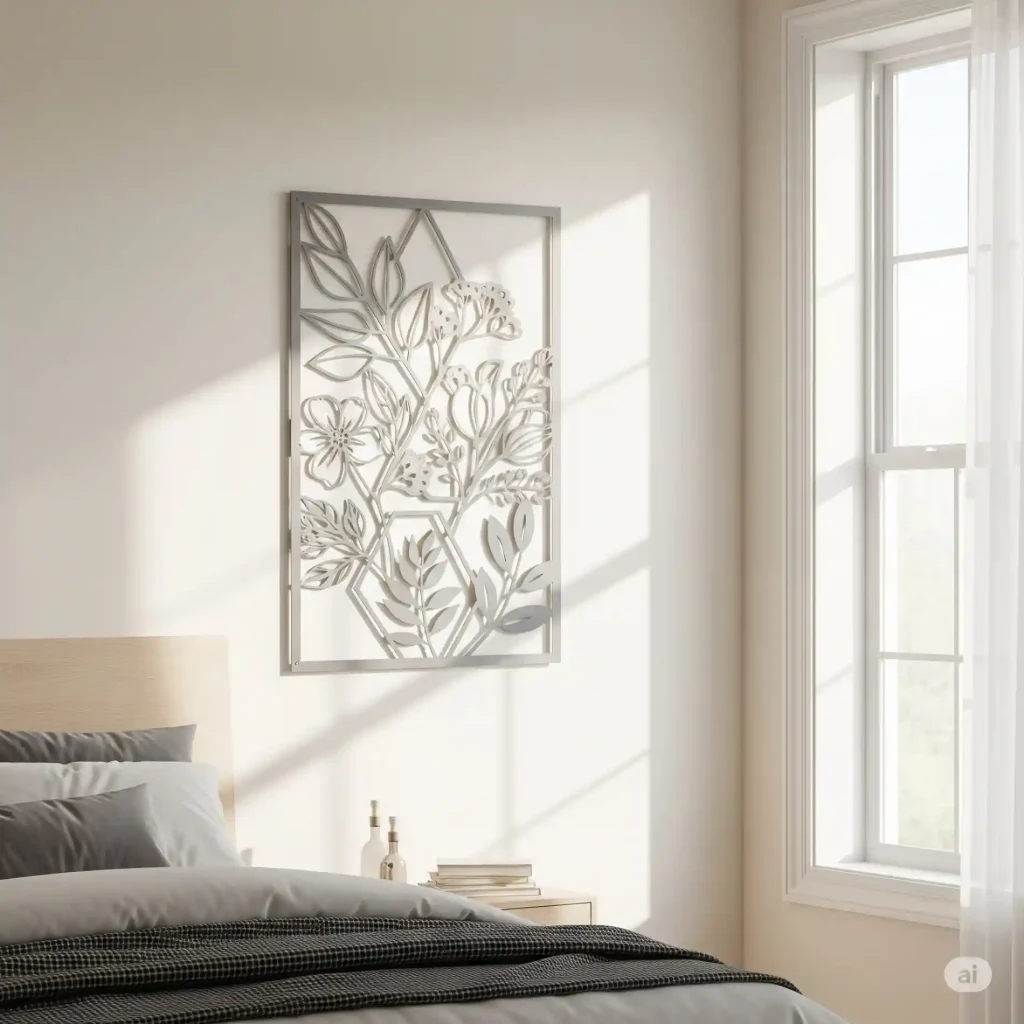 This image shows how metal wall art can introduce a sleek, contemporary, and often industrial element, adding a unique texture and reflective quality that enhances a modern aesthetic.