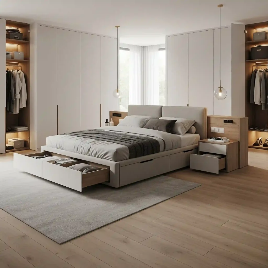 This image showcases how integrated and hidden storage can maintain a clean, minimalist look while providing essential practicality, crucial for a modern and organized bedroom.