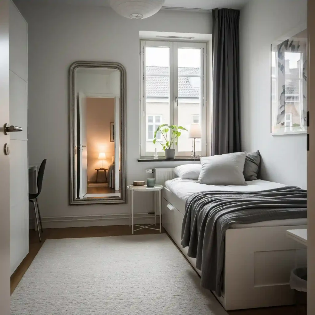 This image shows how a strategically placed mirror can visually enlarge a room and bounce light around, making a small or dim bedroom feel more open and brighter, a key element in many modern designs.