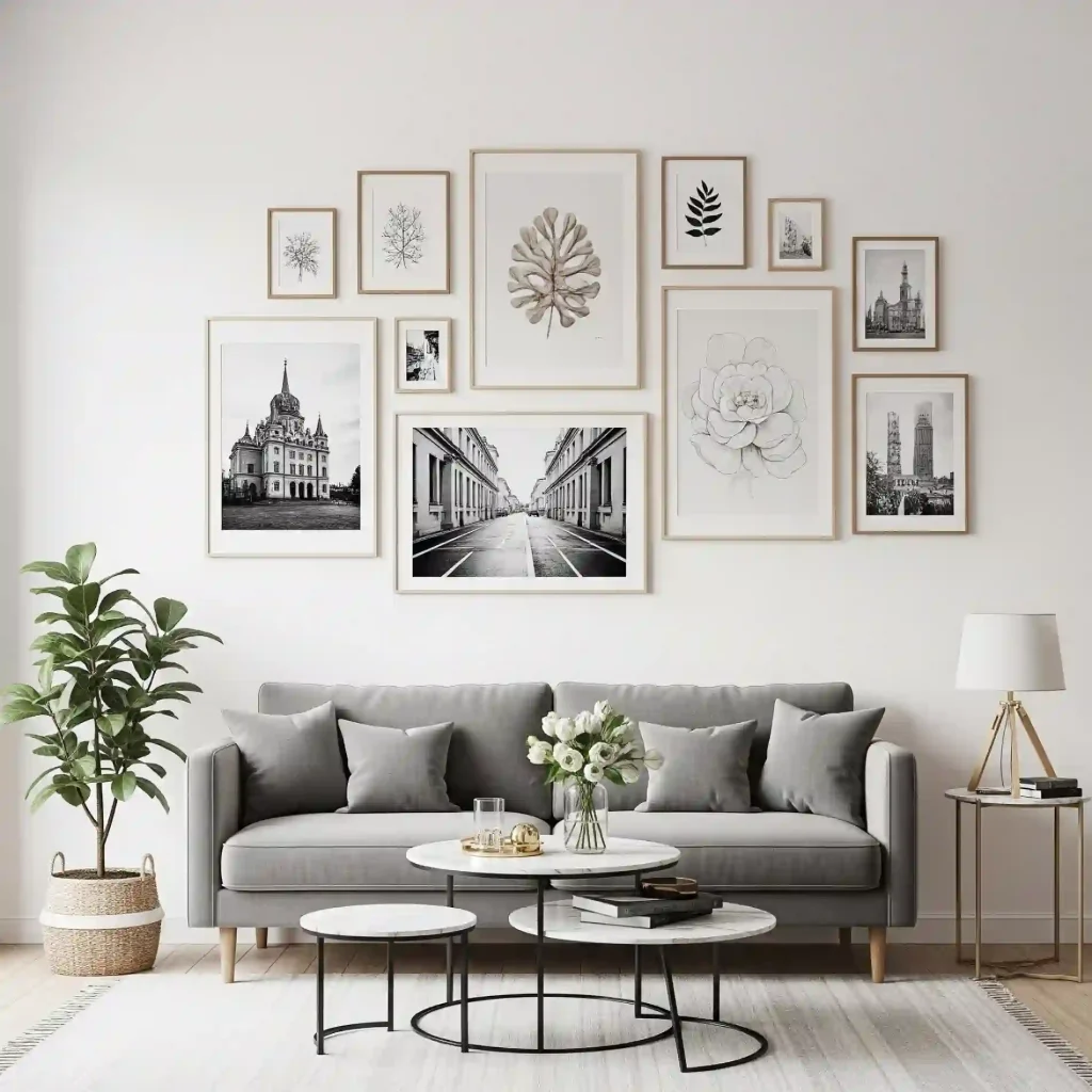 This visual demonstrates how to create a balanced and visually appealing gallery wall that adds personality and a focal point without overwhelming the modern aesthetic. It shows thoughtful spacing and cohesive framing.