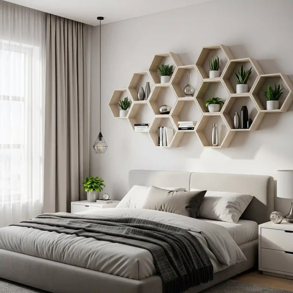 A wall in a modern bedroom featuring a series of hexagonal floating shelves arranged in a geometric pattern, holding small plants and decorative objects.