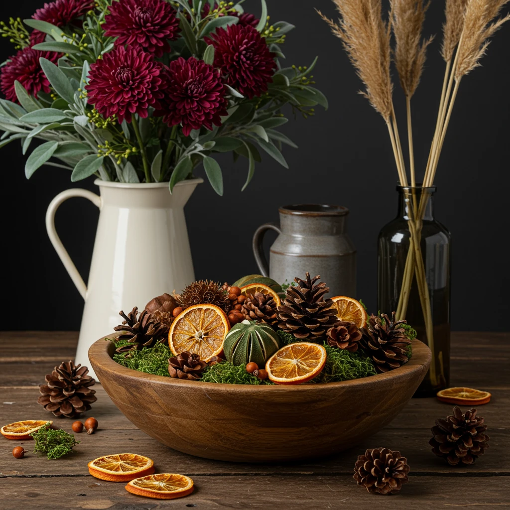 And in the living room, a beautifully carved wooden bowl becomes a centerpiece for an artful display of dried orange slices, aromatic pinecones, and soft moss – a visual and olfactory delight that feels inherently natural and inviting. These thoughtful touches reveal how autumnal florals can subtly yet powerfully convey mood and depth.