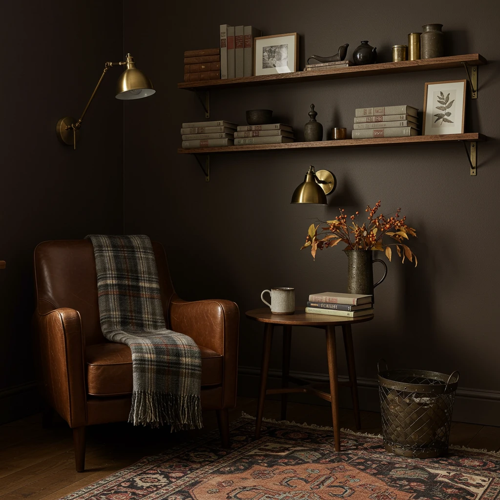 Among the most reassuring autumn home decor ideas 2025 is the concept of crafting a deeply personal retreat within your own living room. Imagine a secluded, dark-toned corner that evokes the comforting feel of a private library or a velvet cocoon. Think inviting warm brown walls, a subtly vintage rug underfoot, and soft, enveloping lighting that feels like a warm wool blanket gently draped around you.