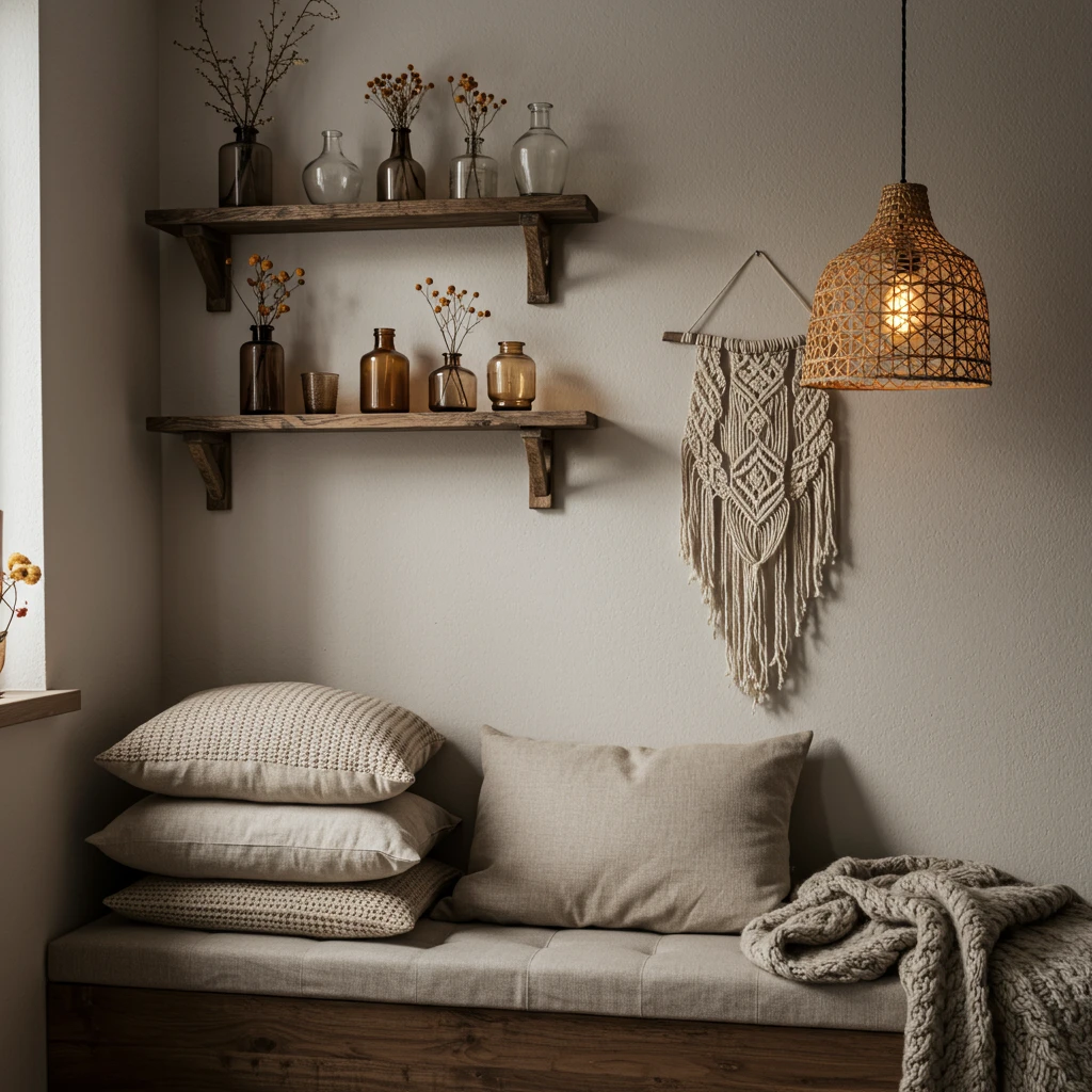 I fashioned a rustic wall shelf from reclaimed wood, adorning it with delicate little vases filled with dried flowers, and hung a beautifully intricate handmade macrame wall hanging. Plywood and foam were ingeniously transformed into comfortable bench seating, which was then covered in neutral linen and generously stacked with cozy, chunky knit pillows.