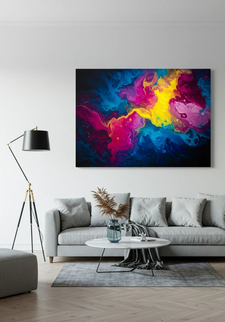 Sometimes, the most sophisticated way to bring color into a living room is through a single, stunning, and oversized piece of abstract art. In a room with neutral walls and simple, neutral furniture, a large, vibrant, and colorful abstract painting can be an incredible focal point. It can inject a huge amount of energy, personality, and a custom, high-design feel into your space.