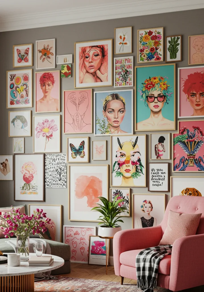 For a cohesive enhancement, you can either use all the same, simple frame color (like all white or all natural wood) to unify the diverse collection, or for a truly maximalist look, you can use a variety of different, colorful frames as well.