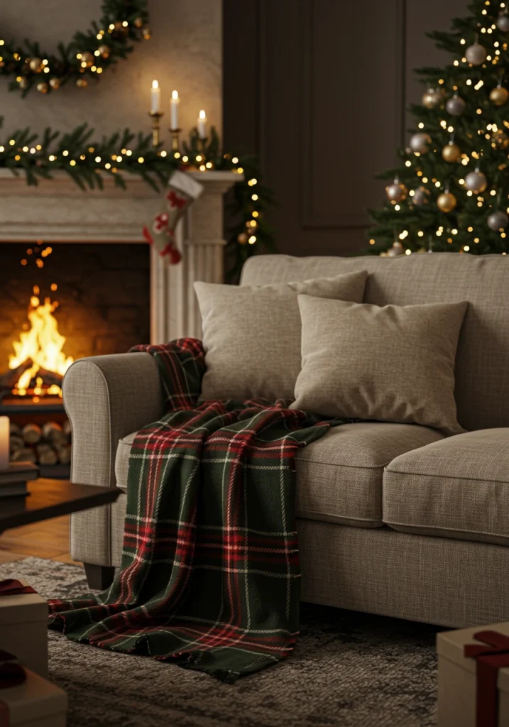 alt text: A cozy Christmas living room with a comfortable sofa layered with a classic red plaid throw blanket.