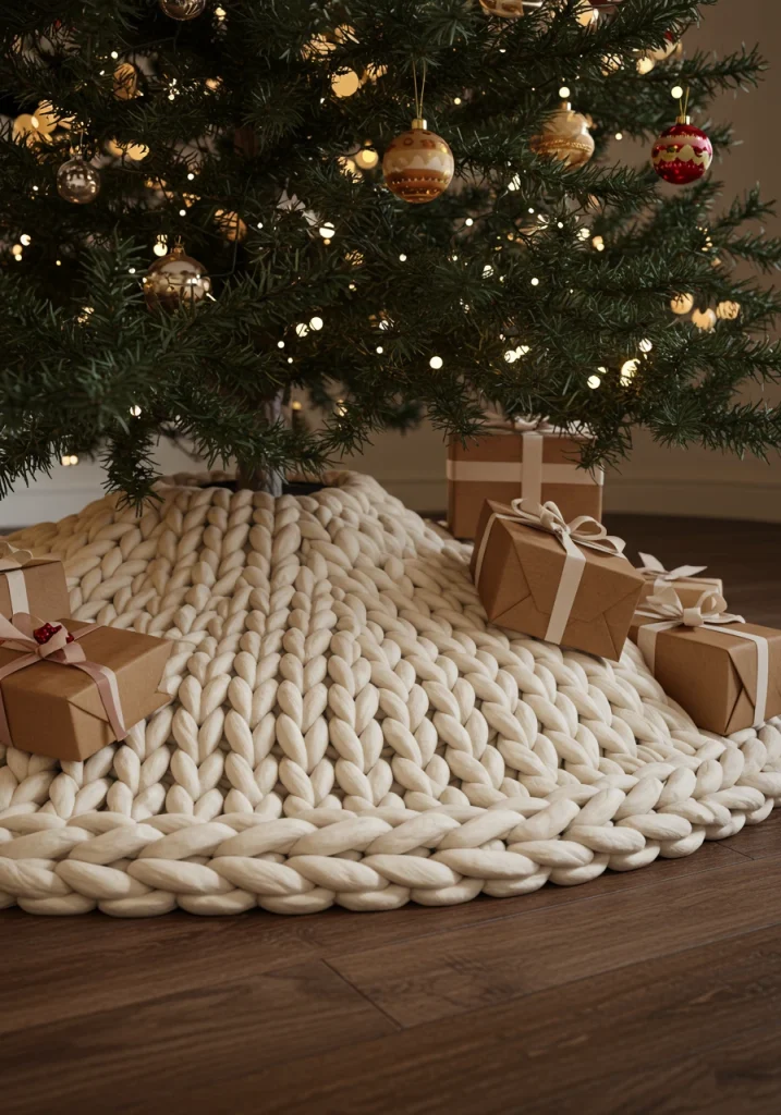alt text: A cozy Christmas tree with a trendy and textural, chunky knit tree skirt at its base.