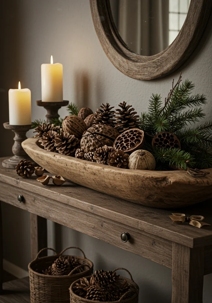 alt text: A cozy Christmas idea using a collection of foraged, natural elements like pinecones as decor.