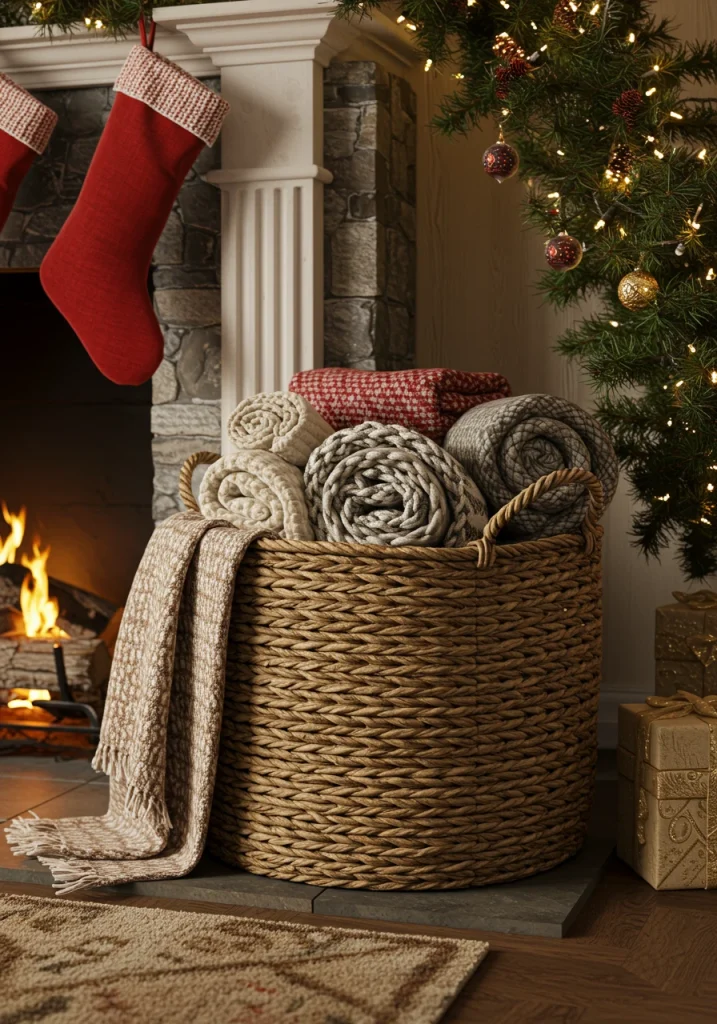• A Blanket Basket: A large, sturdy, woven basket on the hearth is the perfect place to store a collection of rolled-up, cozy, holiday throw blankets.