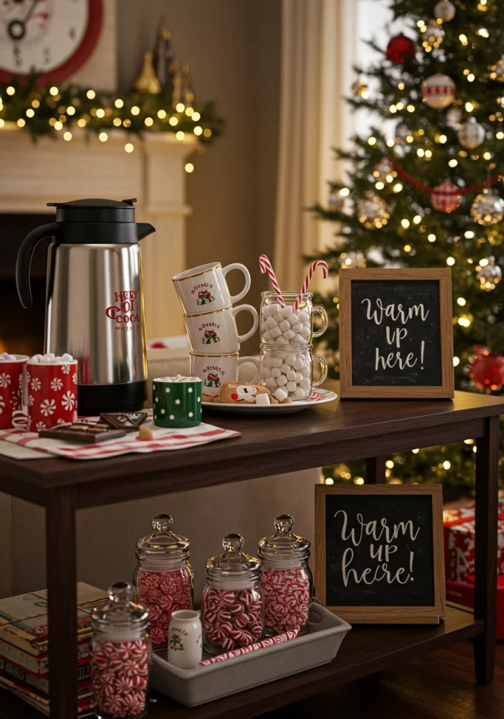 alt text: A cozy Christmas living room idea featuring a fun and festive, DIY hot cocoa bar.
