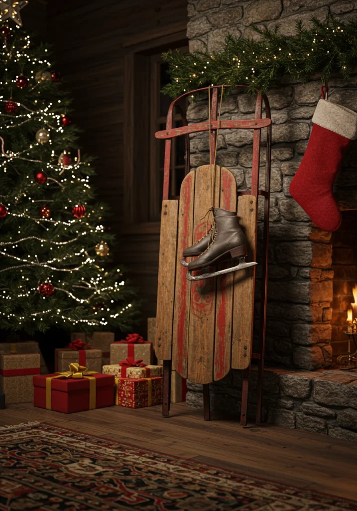 alt text: A cozy Christmas living room with a vintage, wooden sled used as a nostalgic, decorative accent.