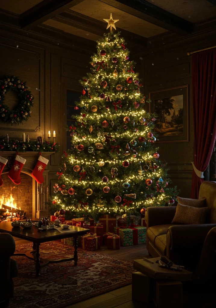 alt text: A cozy, traditional Christmas living room with a large, full, and lushly decorated Christmas tree.
