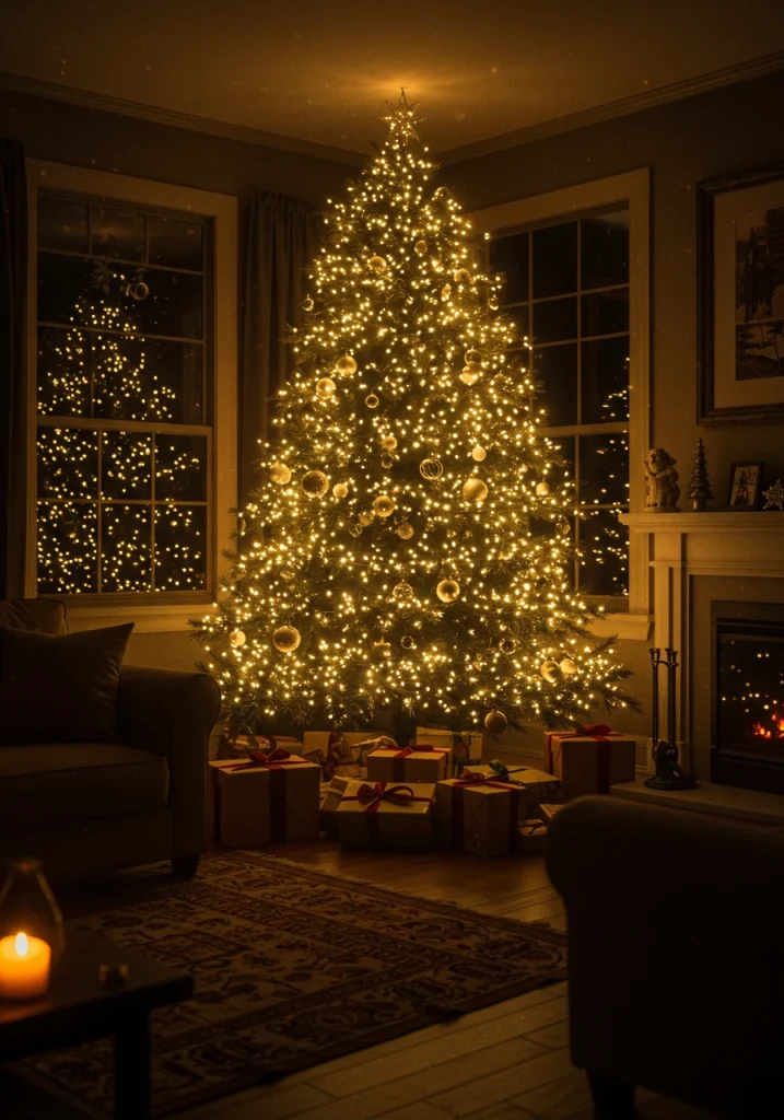 alt text: A cozy Christmas tree decorated with an abundance of warm, golden fairy lights for a magical glow.