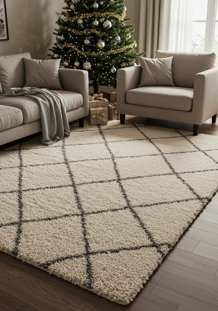 alt text: A cozy Christmas living room anchored by a plush, high-pile, wool area rug.