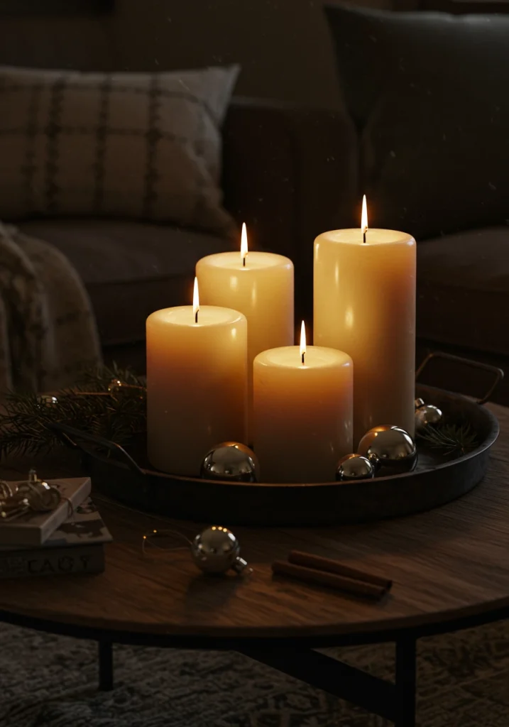 • Pillar Candles: A group of three or five, thick, pillar candles in a festive color like red or a simple, creamy white, arranged on a fire-safe tray on your coffee table.