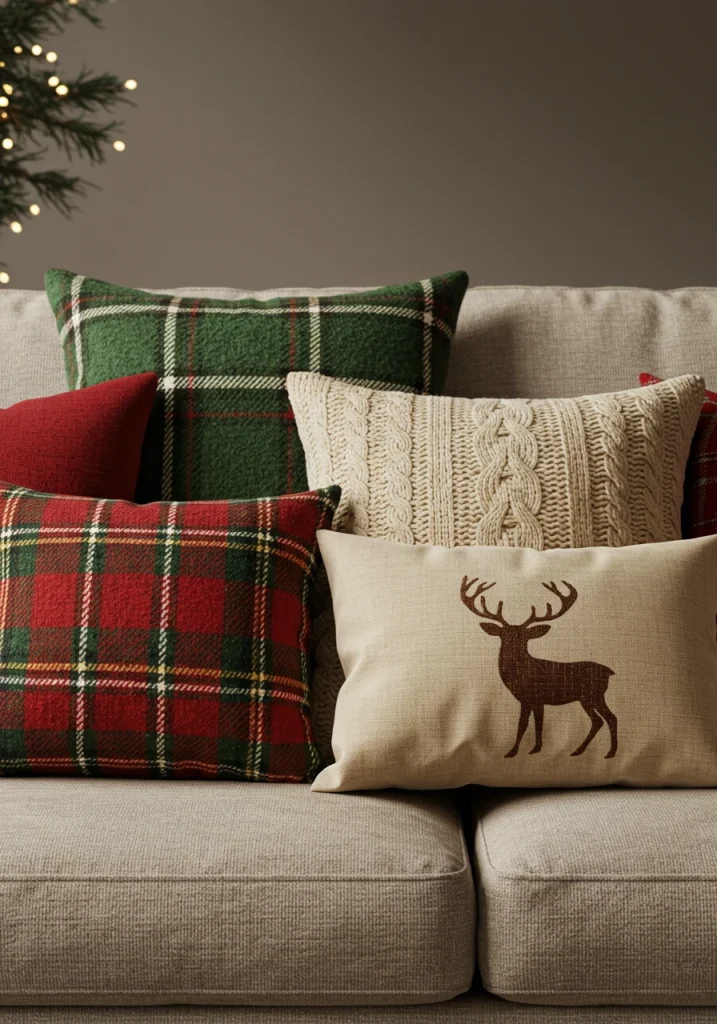 • Festive Fabrics: Look for pillows in cozy, wintery fabrics like wool, velvet, faux fur, and flannel.