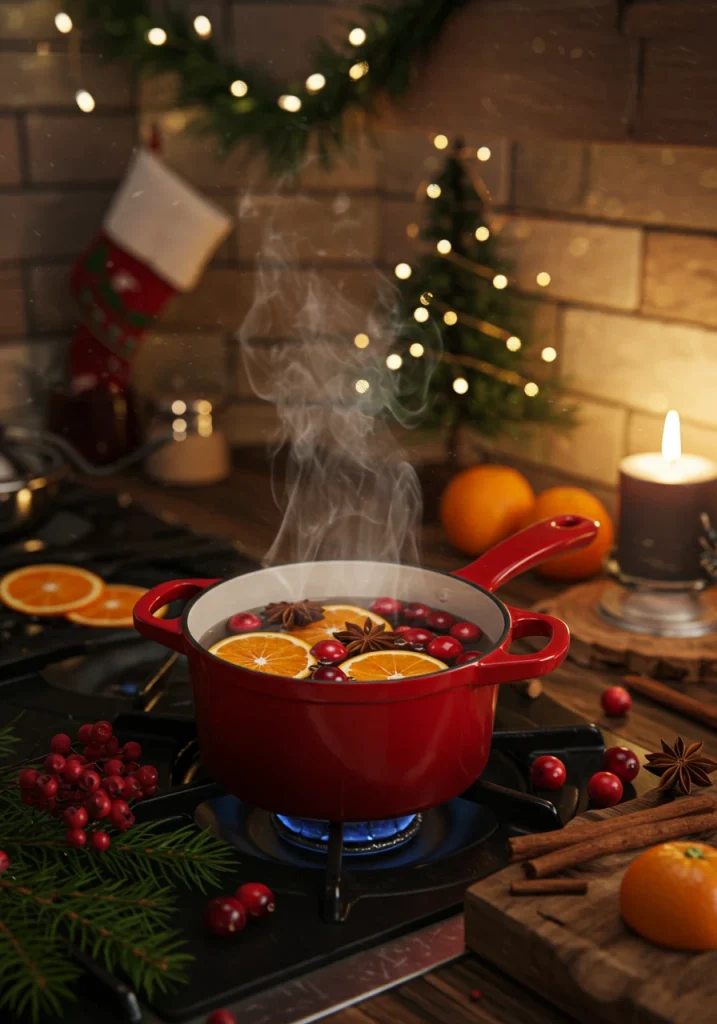 alt text: A cozy Christmas idea focusing on scent: a beautiful, holiday simmer pot on the stove.