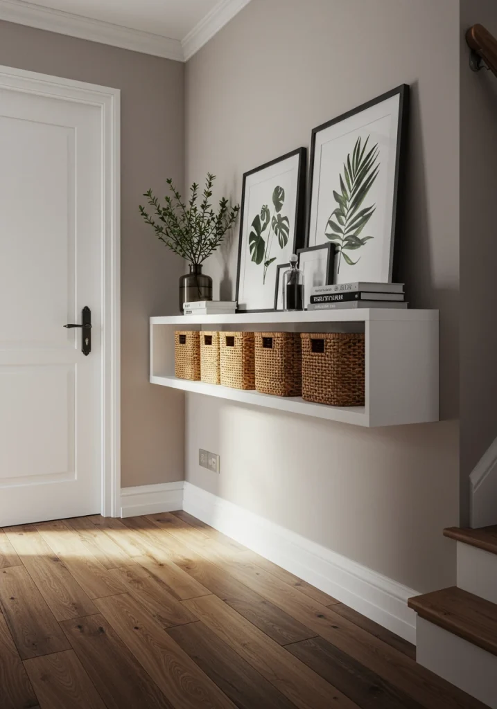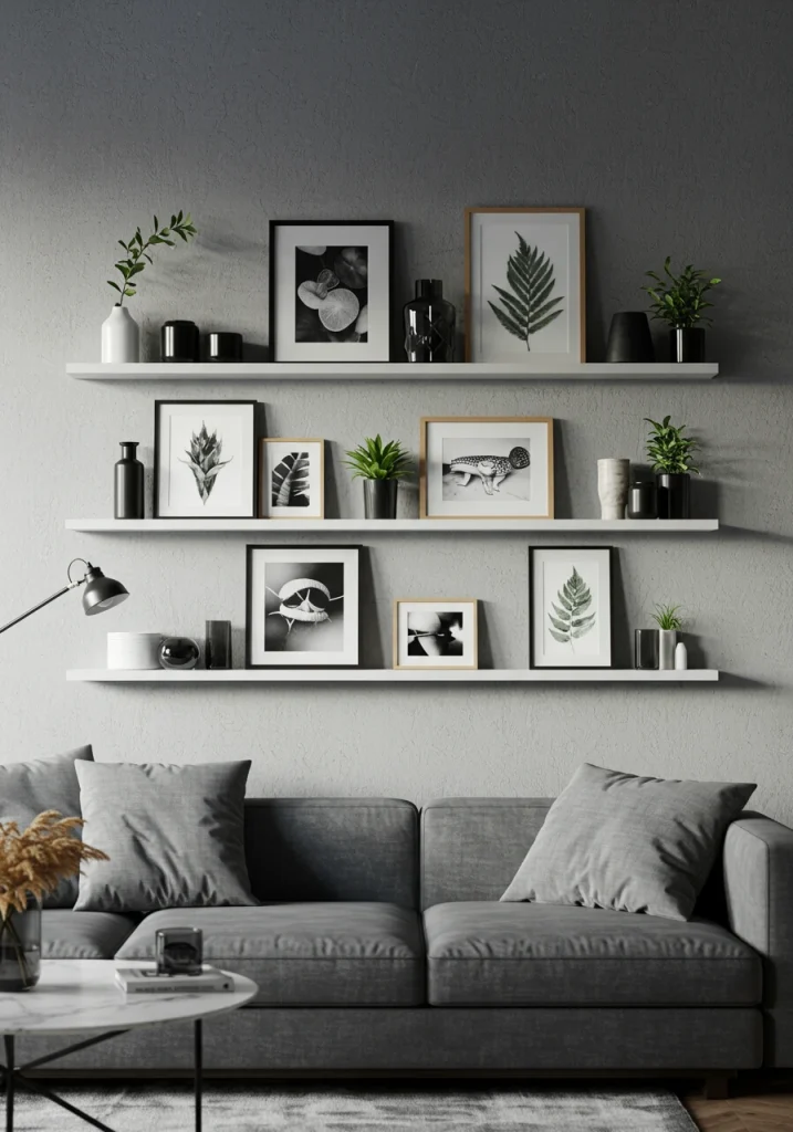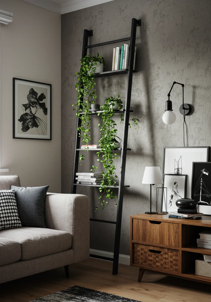 A classic makeover idea. Install a set of simple floating shelves high up on the wall (e.g. above the sofa or the TV). This draws the eye up and provides a stylish perch for lightweight decor items like art prints and plants without cluttering your functional space.