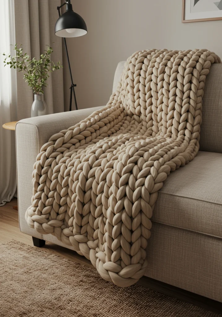An absolute must-have for a cozy 2026 living room. A large oversized chunky knit blanket in a soft neutral color like cream or gray (as seen in your reference image) draped over your sofa instantly adds a huge dose of hygge (or coziness) and sculptural texture.