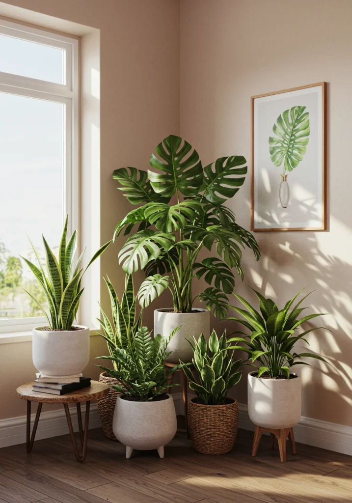 A core 2026 organic modern trend. Even a tiny apartment needs biophilia (life). Dedicate a bright corner near a window as your plant corner. Cluster a group of small and medium-sized potted plants to create a lush green jungle moment.