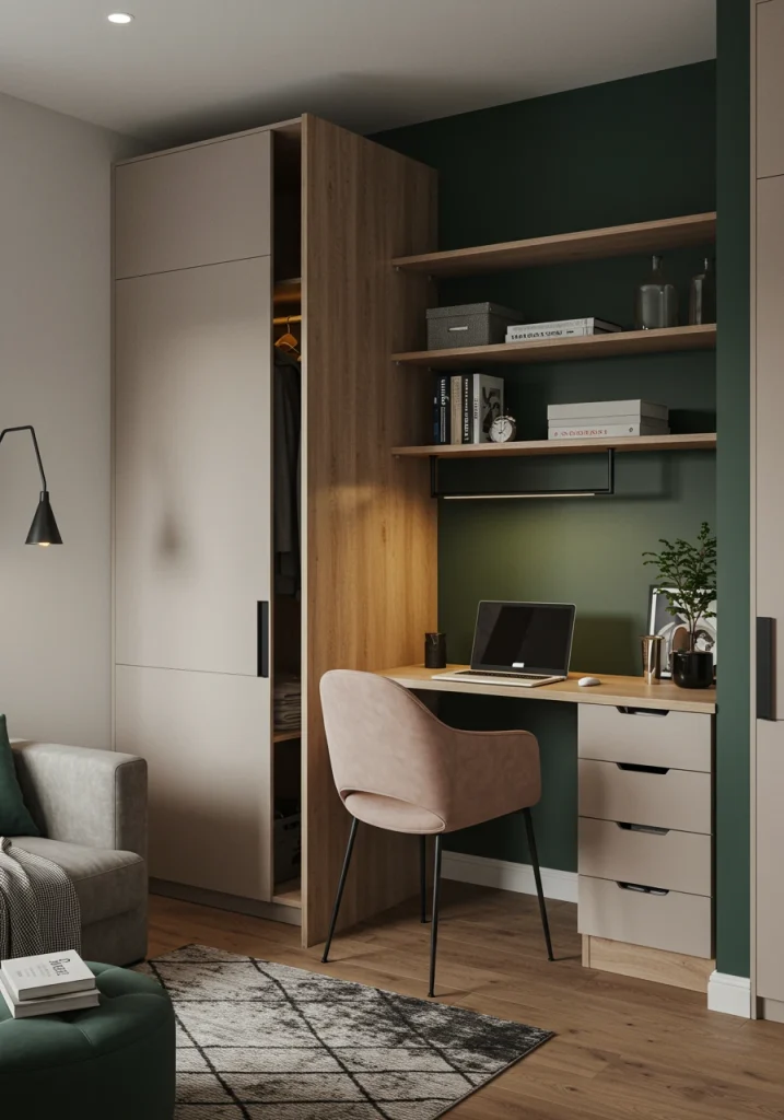 A key 2026 multi-use trend. This makeover transforms your living room closet into a compact cloffice (closet-office). Remove the doors add a built-in desktop install floating shelves and add a small stool or chair. It’s a smart design for working from home in a small space.