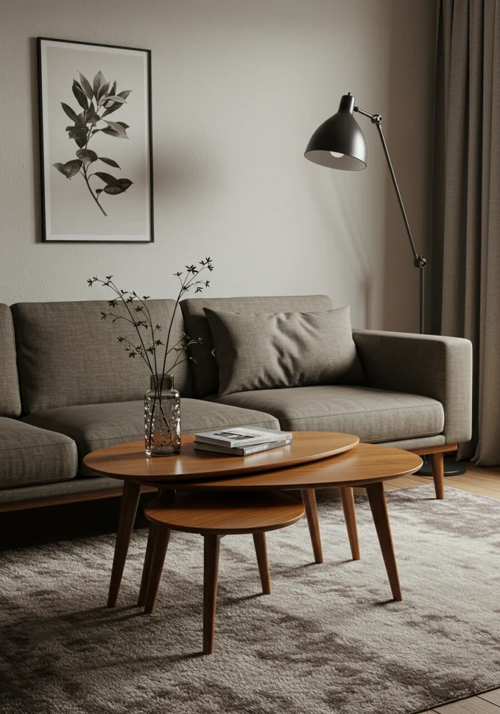 Instead of one large coffee table a set of two or three nesting side tables is a much more flexible solution for a compact space. They provide multiple small surfaces that can be tucked away into one small footprint or pulled out and spread around the room for guests.
