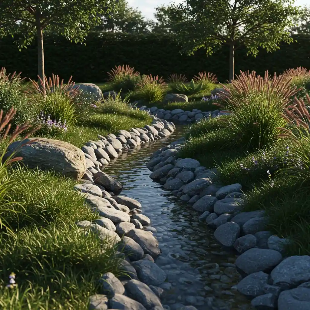 - Add Plants: Plant drought-tolerant grasses and perennials along the edges of the creek bed to soften the look and make it feel more natural.