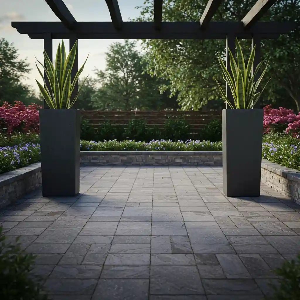 alt text: A pair of tall, modern, rectangular planters used to add vertical height to a flat patio.