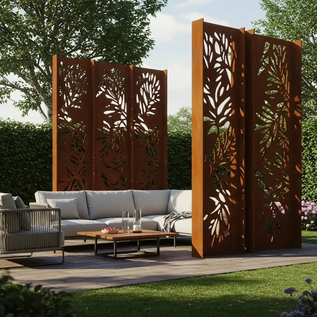 alt text: A series of tall, laser-cut metal privacy screens used to add height and artistry to a flat backyard.