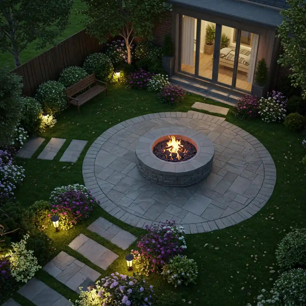 alt text: A flat backyard designed with a central fire pit on a circular patio as a strong focal point.