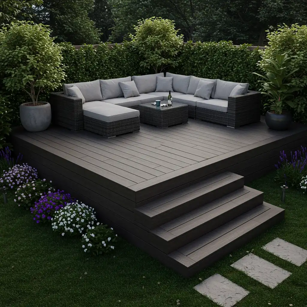 alt text: A raised deck creating a new level and a defined outdoor room in a flat backyard.