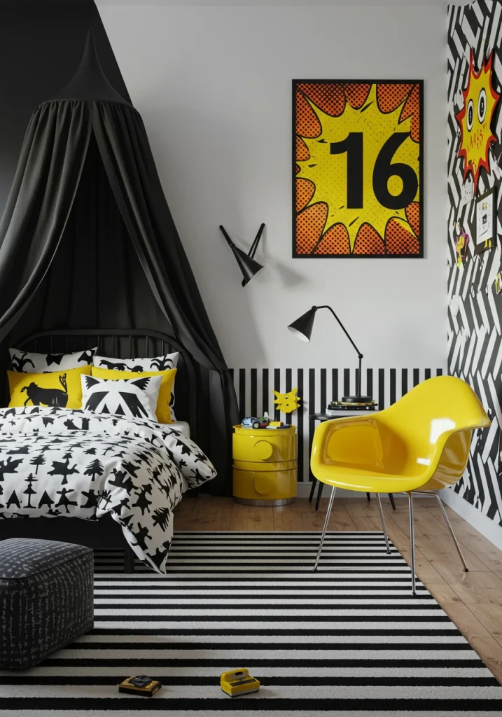 For a look that is energetic, fun, and very contemporary, a bold and graphic, modern style is a fantastic choice for a kid’s bedroom. This style is all about clean lines, simple, geometric shapes, and a high-contrast color palette. It’s a great way to create a room that feels playful and stimulating without being too “cutesy.”