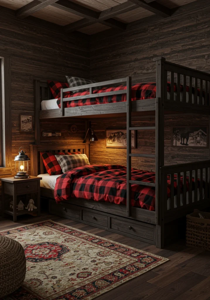 - Bunk Beds: A sturdy, solid wood or a log-style bunk bed is the centerpiece of the room.