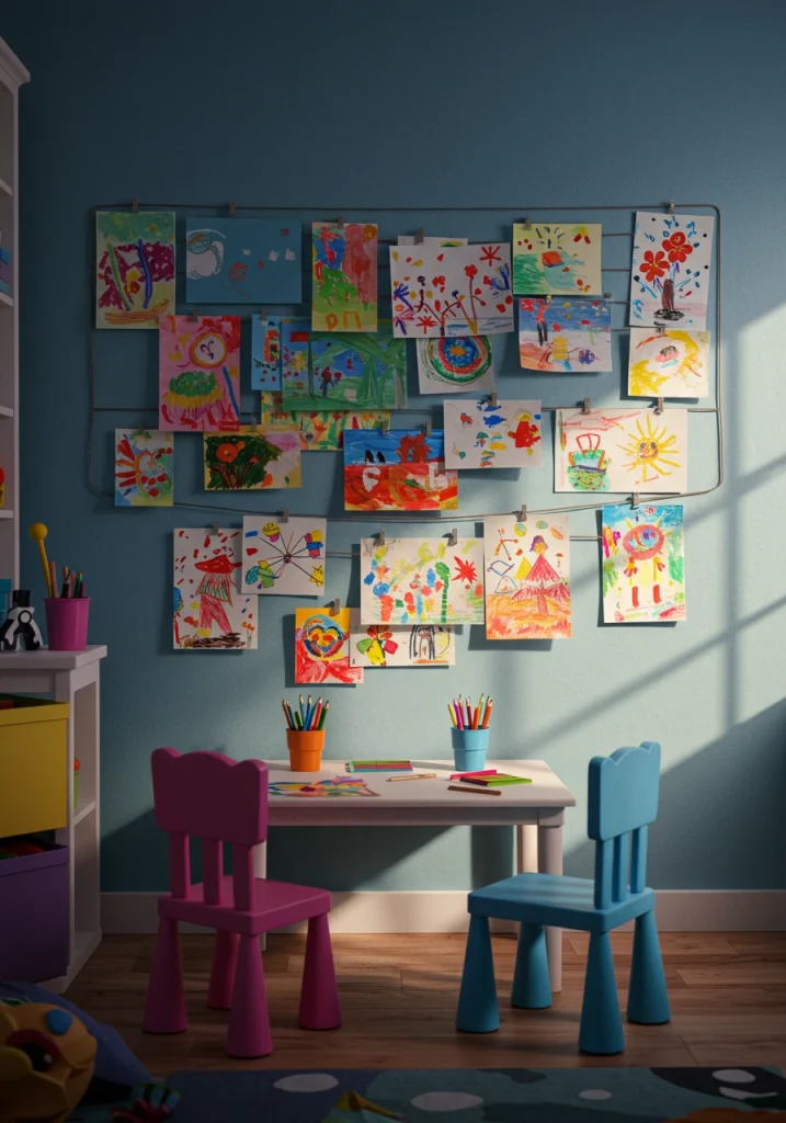 For a very chic and modern enhancement, install a series of simple, slim, forward-facing picture ledges. This will allow your child to easily display not just their flat drawings, but also their 3D creations, like clay sculptures or Lego models.