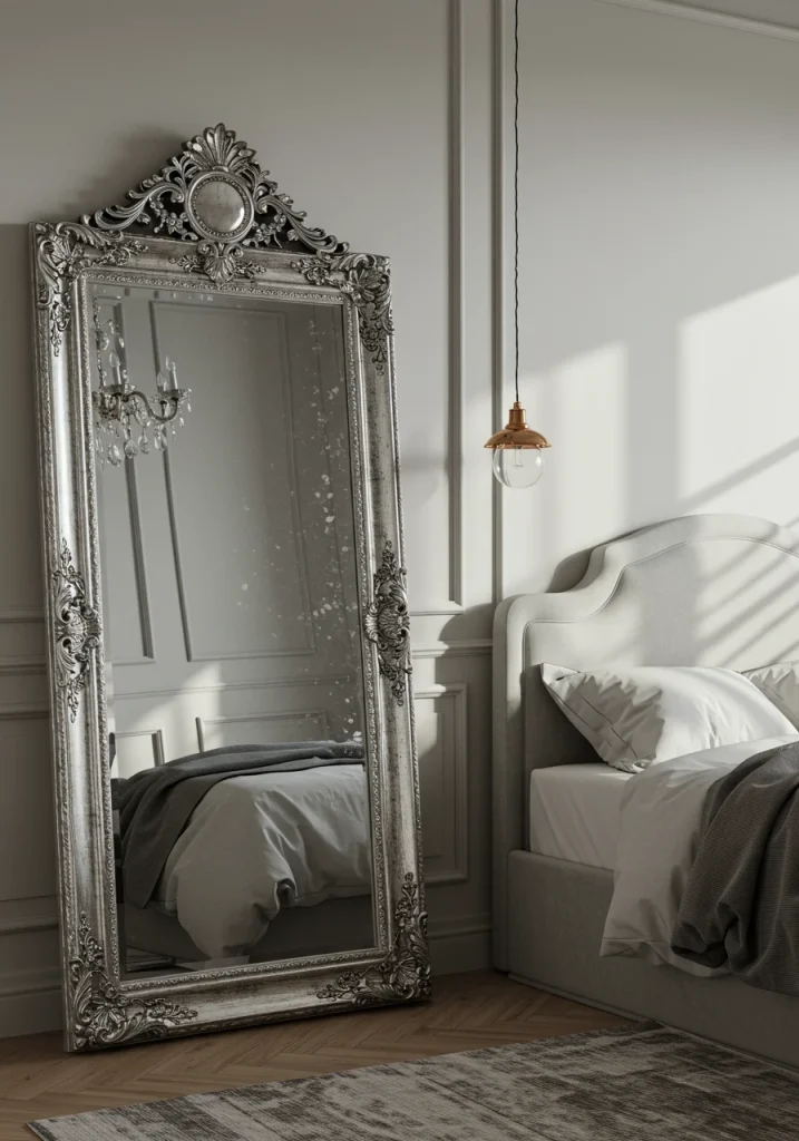 For an enhancement that adds a touch of modern style, choose a very large, oversized, full-length mirror with a simple, thin, metal frame and simply lean it against a wall instead of hanging it. This has a relaxed, effortless, and very chic look.