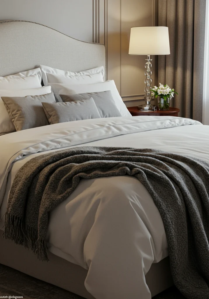 - The Finishing Touch: Drape a beautiful, soft throw blanket made of cashmere or fine wool across the foot of the bed, over the folded duvet.