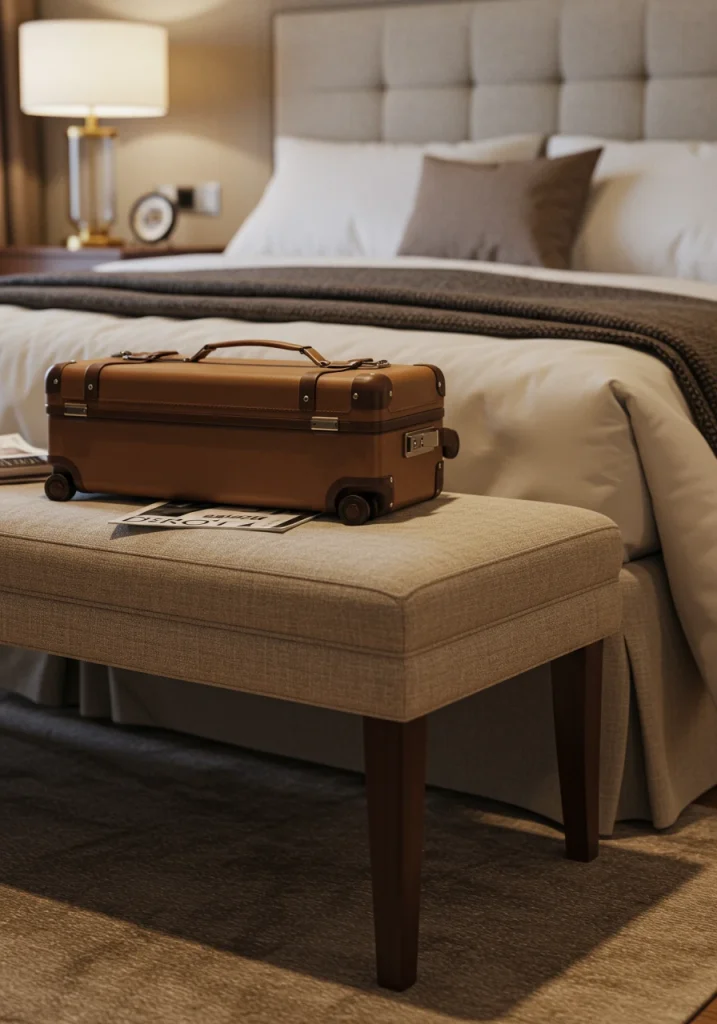 This is one of the most thoughtful and essential details for a truly elegant and functional guest bedroom. Providing a designated spot for your guests to place their suitcase is a hallmark of a high-end hotel and a very considerate gesture. It saves your guests from having to put their luggage on the floor, which can be awkward to access, or on top of your beautiful bedding or a nice chair.