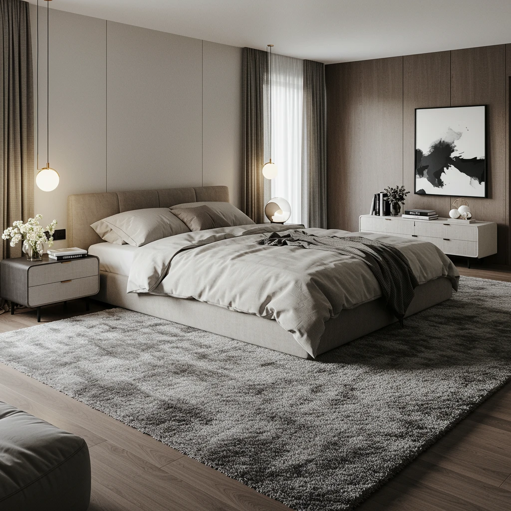 Anchor your bedroom and enhance its comfort with a plush area rug that invites softness underfoot. For 2025, choose luxurious materials like deep pile wool, sumptuously soft silk, or high-pile shag in colors that perfectly complement your overall palette.