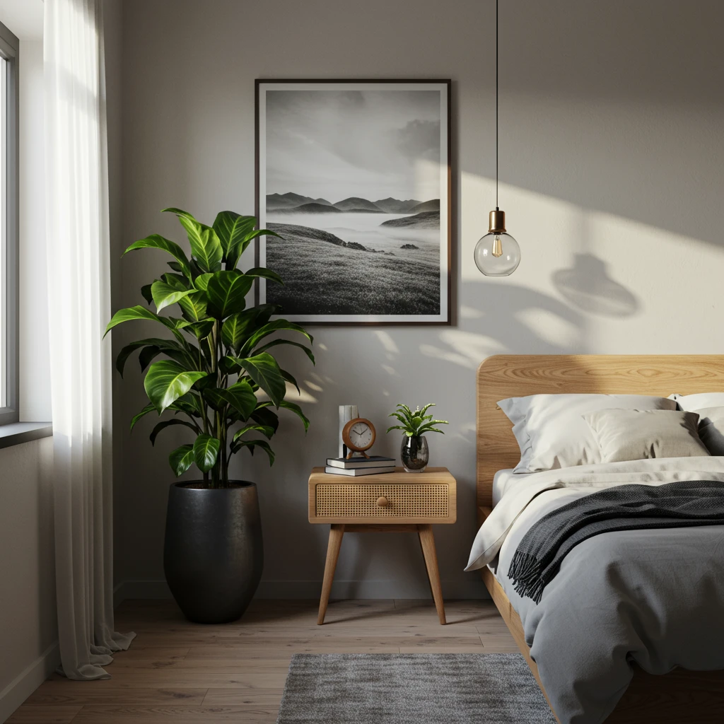 Introduce the calming presence of nature into your 2025 bedroom with biophilic design elements. This trend involves incorporating living plants (such as snake plants, ferns, or peace lilies), natural wood textures in furniture or flooring, subtle stone accents in decor, and artwork depicting tranquil natural landscapes.