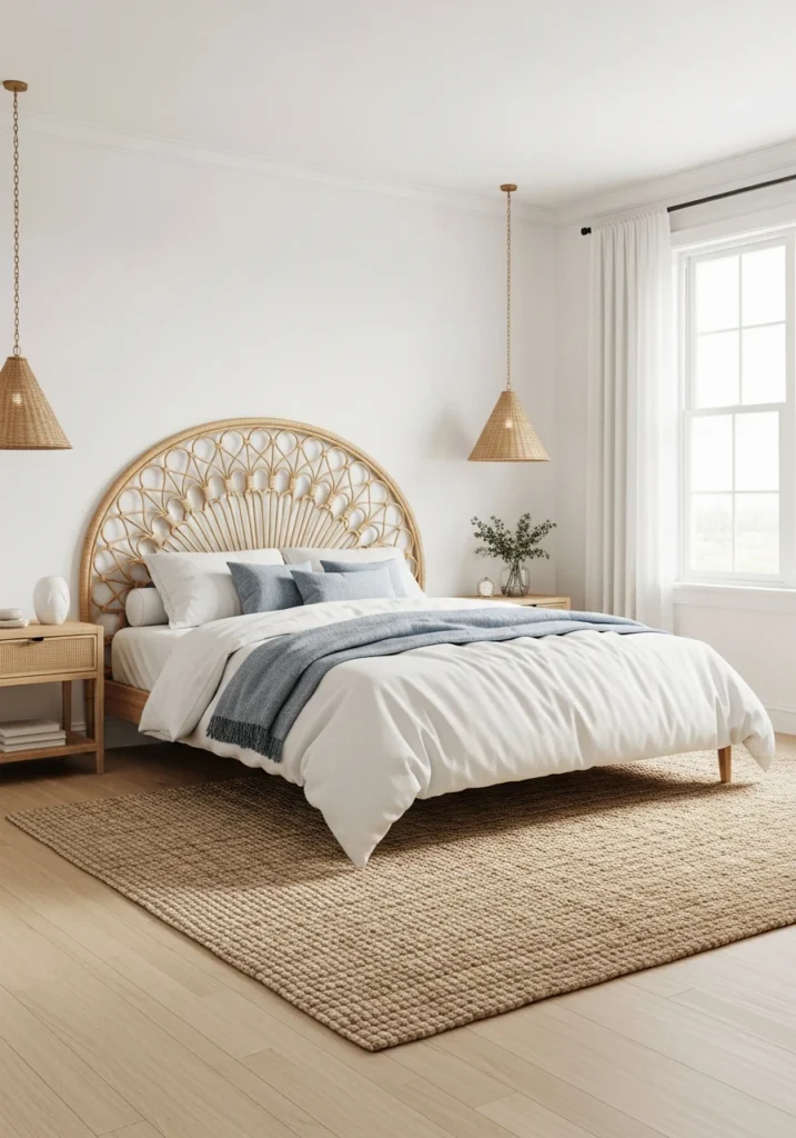 Create a breezy and relaxed seaside escape. This style uses a light and airy palette of white, sandy beige, and soft, watery blues to create a calm and restful atmosphere.