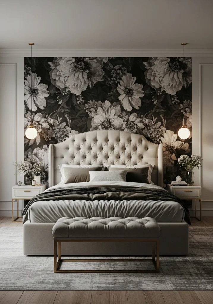 A guest room is the perfect place to be bold with a dramatic, patterned wallpaper. Use a large-scale, floral, botanical, or geometric wallpaper on the wall behind the bed to create a stunning, high-impact focal point.