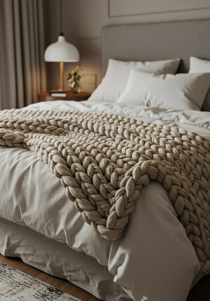 The ultimate cozy accessory (as seen in your reference image). A large oversized chunky knit blanket in a soft neutral color like cream or gray draped across the foot of the bed is a must-have for adding a luxurious handmade textural warmth.