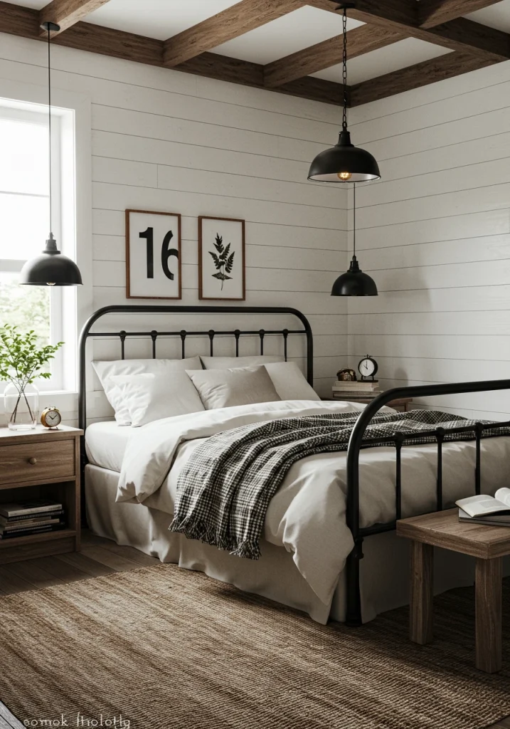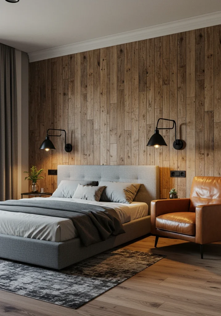 Another huge 2026 trend. This cozy design contrasts raw rustic elements with clean modern lines. A reclaimed wood accent wall paired with a modern upholstered bed and sleek black sconces is a perfect example.
