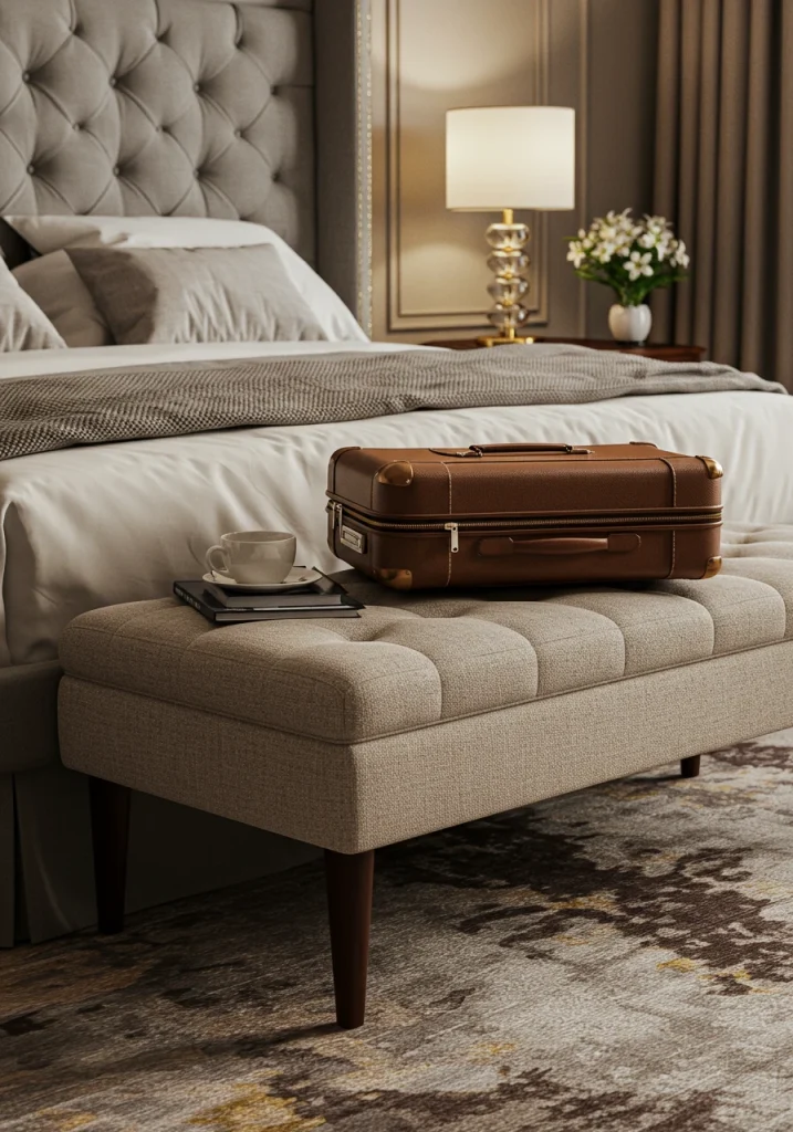 This is the #1 most thoughtful hotel amenity for a guest bedroom. Providing a folding luggage rack or a stylish upholstered bench at the foot of the bed gives your guests a designated spot for their suitcase so they don’t have to use the floor.