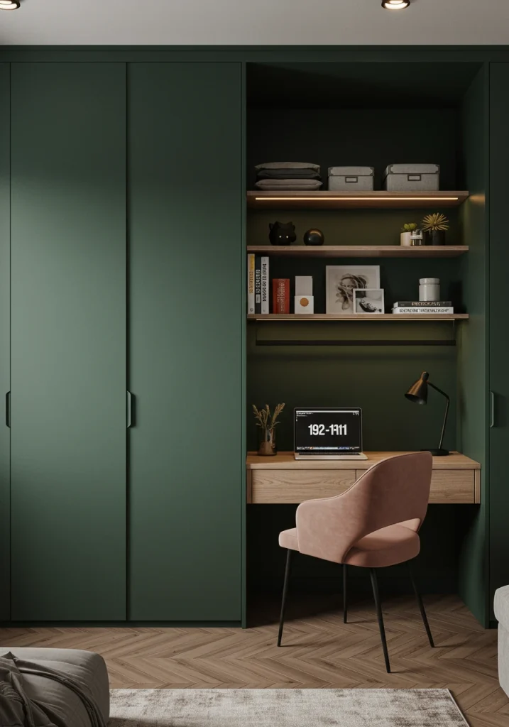 A very innovative multi-purpose 2026 remodel. If your guest room must also serve as a home office transform the closet into a compact cloffice (closet-office). Remove the doors add a built-in desktop and shelving for a functional work zone that is separate from the guest bed.