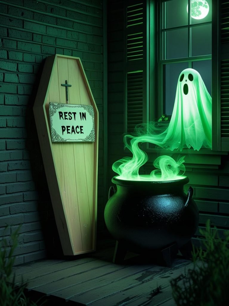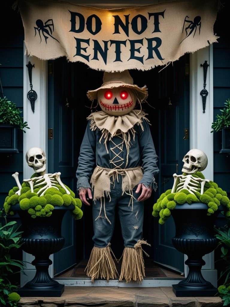 About This Image: This porch is pure narrative fun. Instead of saying “Happy Halloween,” it asks, “Who just arrived here?” The props do all the work, creating a charming, magical story that is so much more engaging than a simple decoration. The best part is that you can find these kinds of treasures at any local flea market or thrift store.