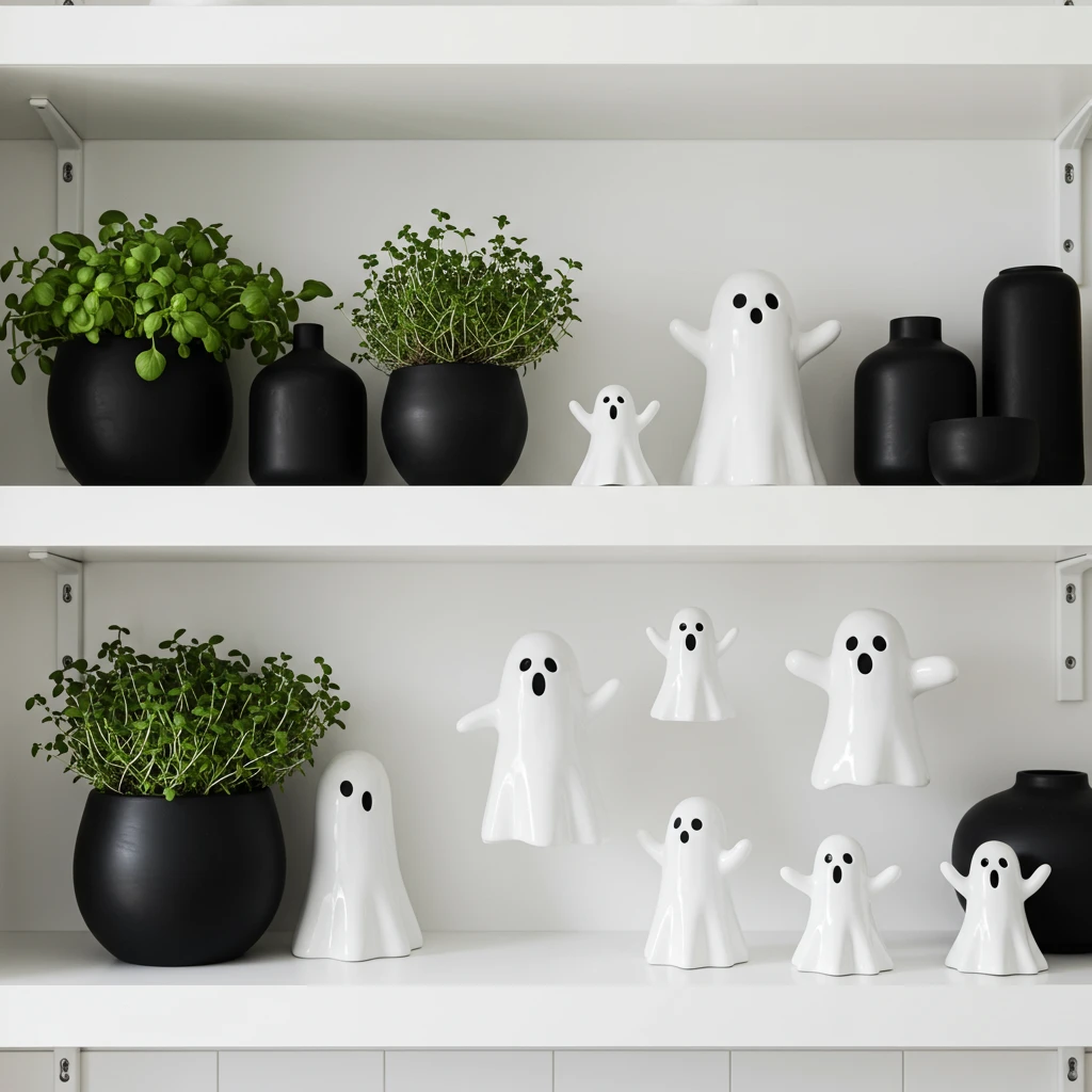 Add a touch of ethereal whimsy with Floating Ghost Shelves. This simple DIY idea involves placing small, friendly ghost figurines or cutouts on open shelving, making them appear to float playfully among your kitchen items. It’s a charming way to embrace the spooky season without going dark.