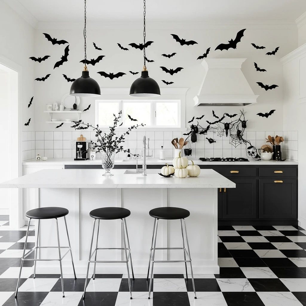 Let your kitchen’s walls take flight with batty backsplashes and Halloween wall art. This trend uses graphic elements like bat decals, ghost drawings, and chalkboard art to create a dynamic and engaging backdrop for your kitchen’s spooky transformation. It’s a bold way to make a statement.