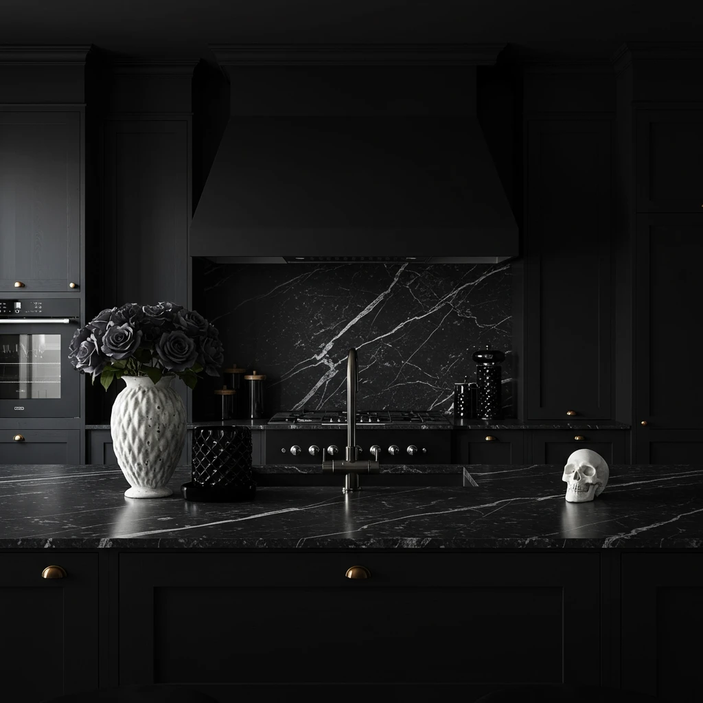 For a sophisticated and bold statement, embrace Bold and Black decor with matte finishes. This trend focuses on sleek, dark cabinetry, appliances, and accents, creating a luxurious and unexpectedly cozy atmosphere with low ambient lighting that grounds your spooky season in undeniable elegance.